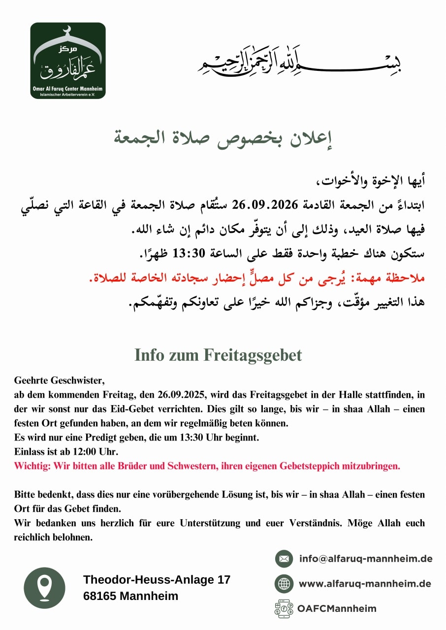 Wir begrüßen Sie herzlich auf unserer Internetseite und freuen uns über Ihr Interesse an Omar AL-Faruq Moschee. Als eine islamische Religionsgemeinschaft und gemeinnütziger Verein sind wir im religiösen, sozialen und kulturellen Bereich tätig. Wir kümmern uns um die allumfängliche religiöse Betreuung von Muslimen in der Region und setzen uns für den Zusammenhalt und für das friedliche Zusammenleben in unserer Gesellschaft ein.